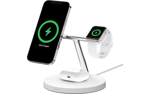 Rechargez votre iPhone, Apple Watch et AirPods rapidement et simultanément grâce à cette station de recharge Belkin. Elle se compose d’un support de recharge de 7,5 W pour votre iPhone, d’un module de recharge aimanté pour votre Apple Watch et d’un support de recharge de 5 W pour vos AirPods.